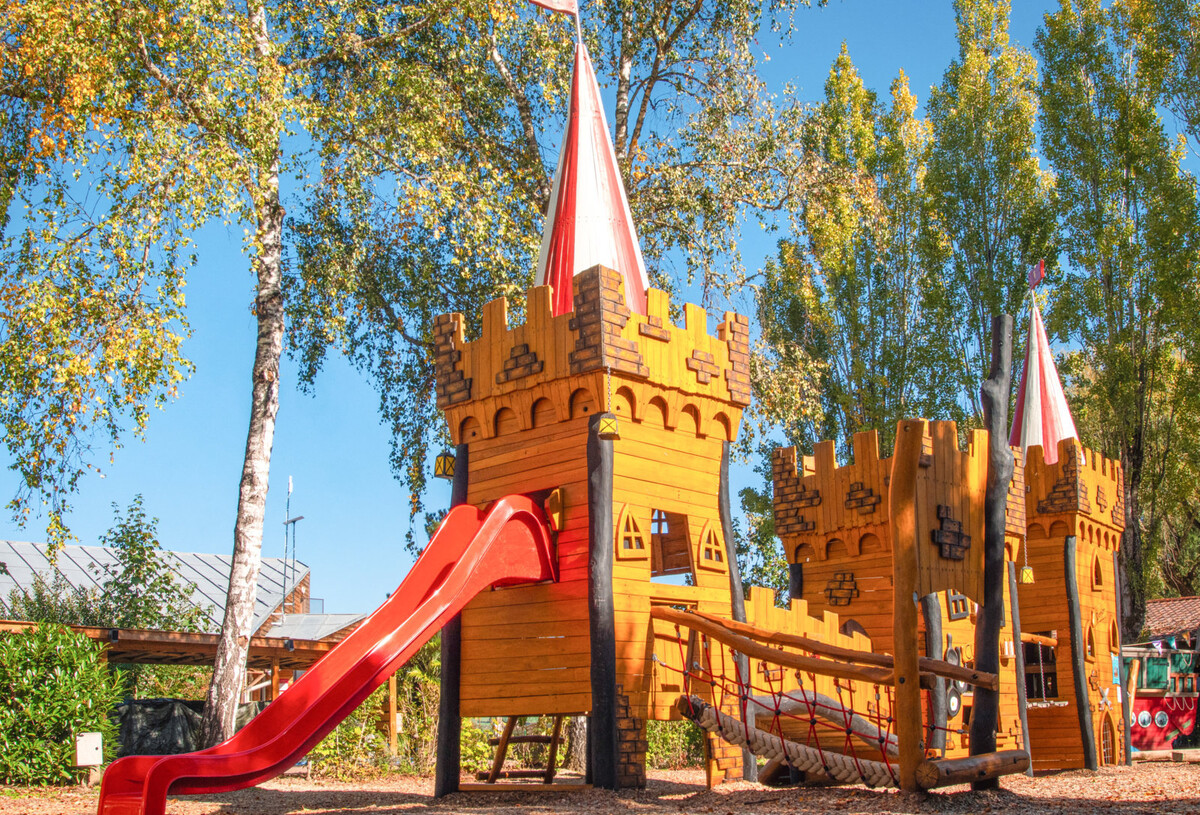 Finden Sie einen Holzspielplatz für Ihre kleinen Abenteurer auf dem Campingplatz.