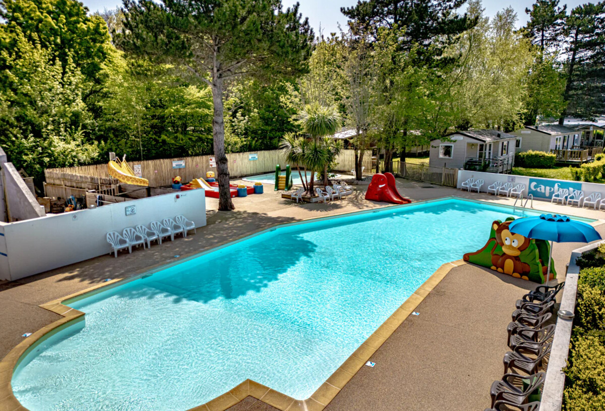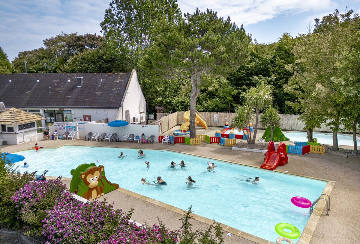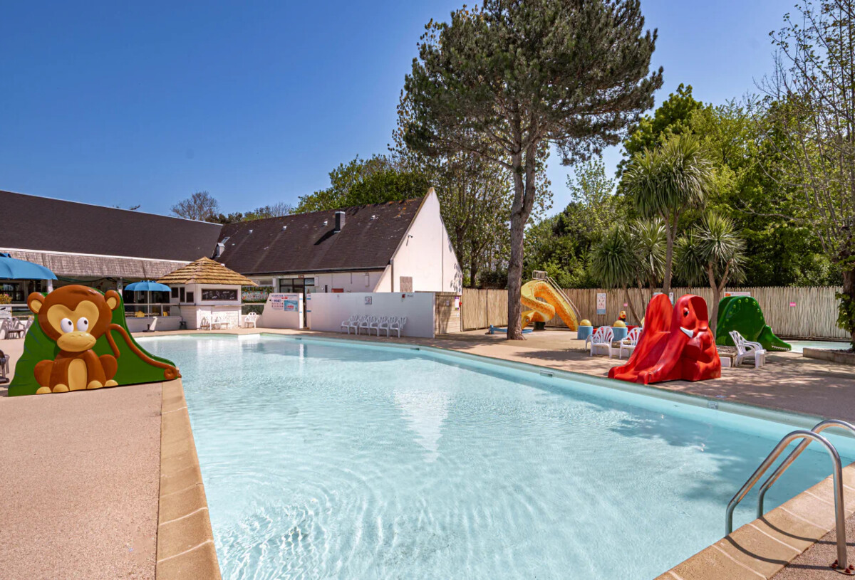 Entdecken Sie unseren Badebereich mit beheiztem Außenpool (von Anfang bis Ende geöffnet), Planschbecken und Vipère-Rutsche für Kinder unter 6 Jahren. Ein idealer Ort für die ganze Familie!