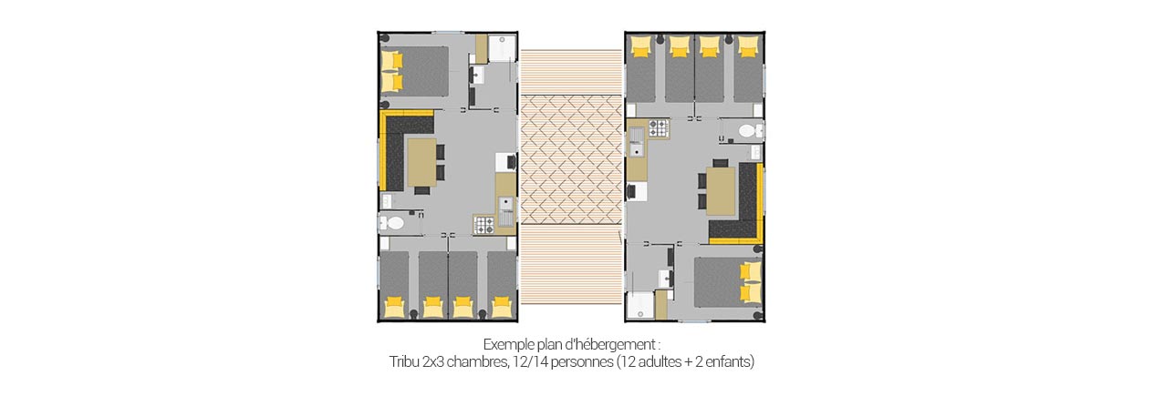 Diese Unterkunftskategorie verfügt über eine große Kapazität. Die Tribu-Unterkunft bietet Platz für 8 bis 14 Personen. Um sich zu treffen und wunderbare Momente in Familie oder mit Freunden zu verbringen, verbindet eine große gemeinsame Terrasse die 2 Unterkünfte für 4 oder 6 Zimmer.
