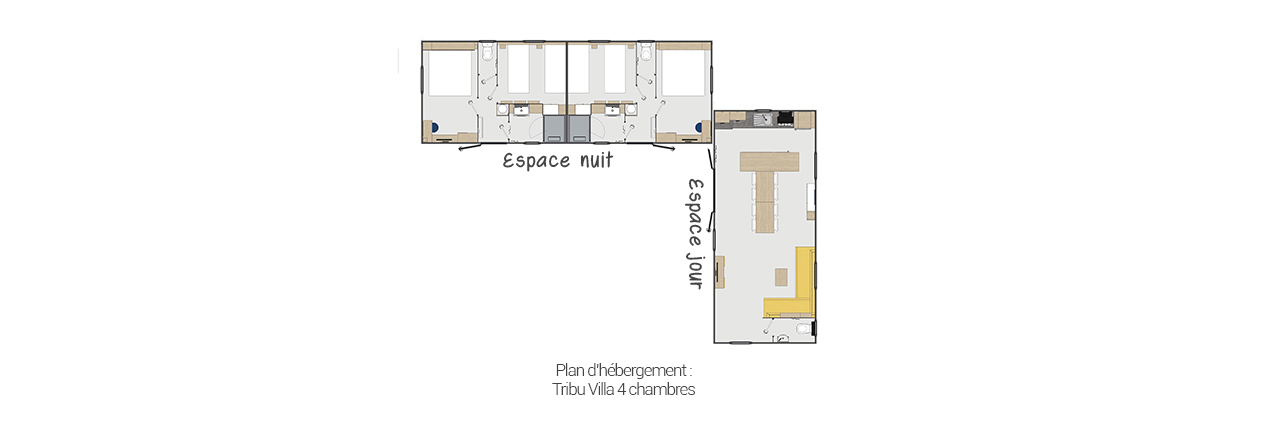Profitieren Sie von der Tribu Villa-Reihe: 2 Mobilheime, angeordnet in Form eines "L", um Ihre ganze Familie zusammenzubringen. Dank der großen gemeinsamen Terrasse, die die 2 Mobilheime verbindet, können Sie sich zu lustigen und fröhlichen Momenten treffen. Die Tribu besteht aus einem Schlafbereich mit 4 Schlafzimmern und 2 Badezimmern sowie einem Tagesbereich mit einem großen Wohnzimmer und einer Küche.